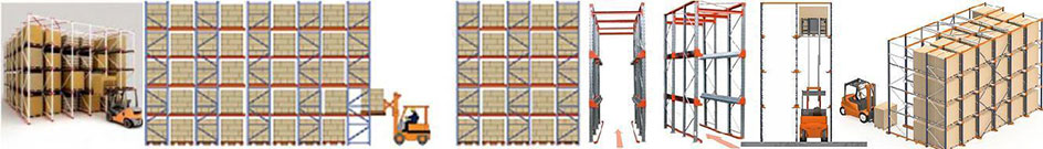Набивные глубинные стеллажи предствляют из себя достаточно простую систему - рамы, выстраиваются в одну линию через определенные промежутки, соединенные специальным профилем, после чего на них устанавливаются ложементы для хранения паллет (сделанные из оцинкованной стали). После чего сверху устанавливаются балки и крестовины, соединяющие эти ряды рам.