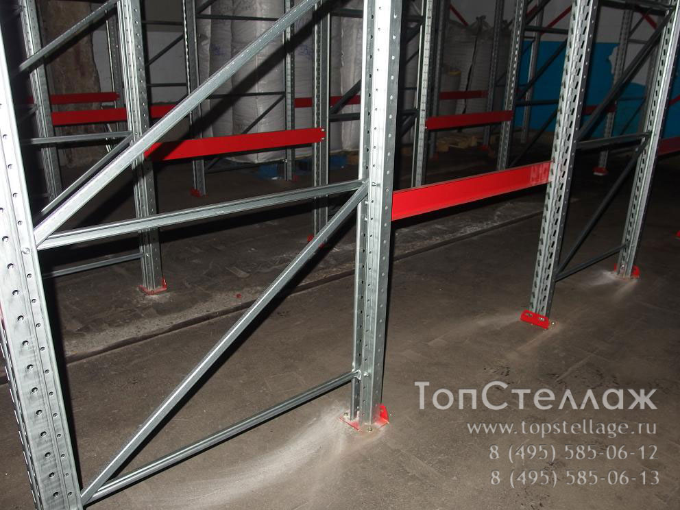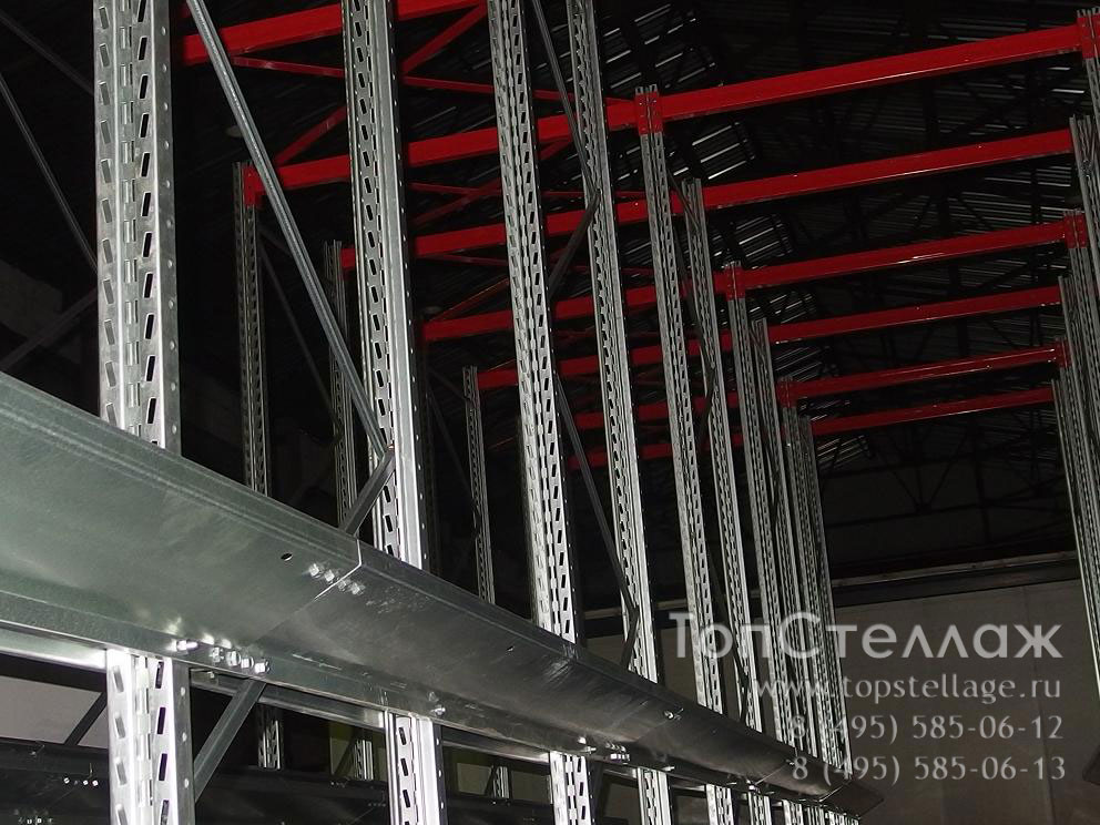 Ниже приводим фотографии, дающие предстваление об устройстве этих стеллажей. Расчет этих систем всегда индивидуален исходя из площади склада и используемых паллет.